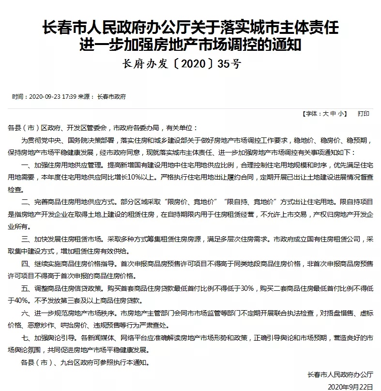 9月23日,长春市人民政府官网发布《长春市人民政府办公厅关于落实城市主体责任,进一步加强房地产市场调控的通知》。调整商品住房信贷政策。购买首套商品住房贷款最低首付比例不得低于30%,购买二套商品住房最低首付比例不得低于40%。不予发放第三套及以上商品住房贷款。
